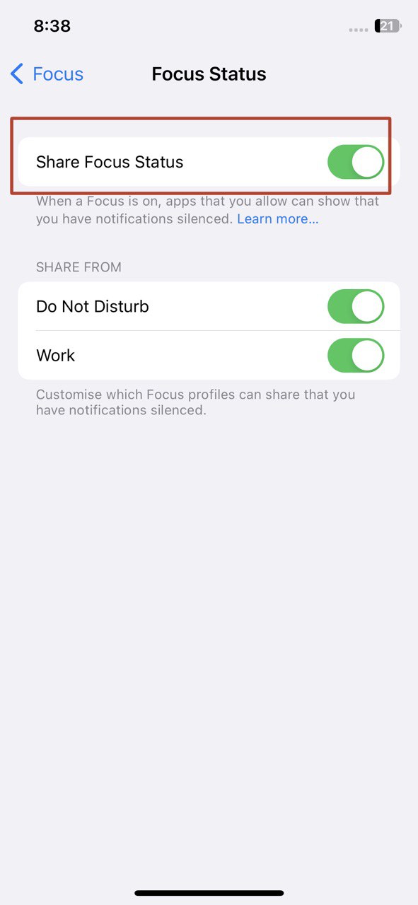 By default, Share Focus Status is turned on. Tap on the toggle button to disable it. Your Focus status will no longer be shared.