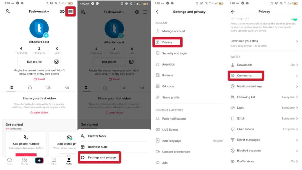 To check your privacy settings: Go to your TikTok account, tap the 3 lines> tap Settings and privacy > Privacy > scroll down Comments. Under who can comment on your videos and stories, select one Everyone, Follower that you follow back, or No one.